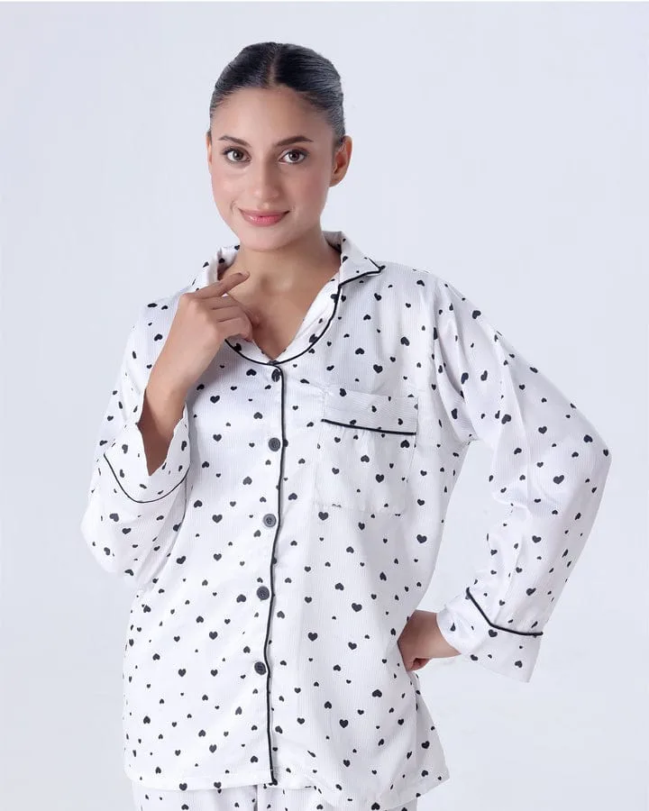 Unwind in luxury with this elegant silk pajama suit, designed for both comfort and style. The Black Hearts Collection adds a touch of elegance to your loungewear.